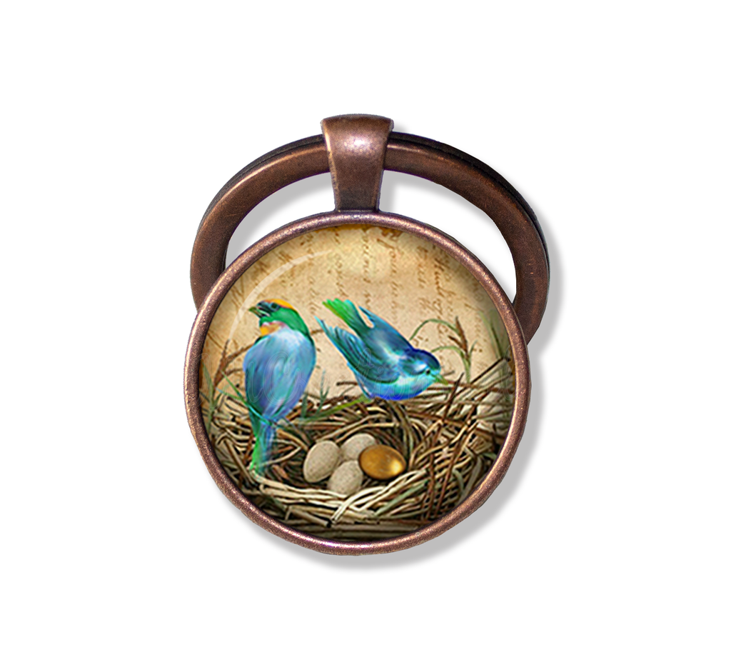 This charming handmade glass pendant necklace features a beautiful scene of two blue birds on their nest with a golden egg, perfect for bird and nature enthusiasts just in time for back-to-school. Crafted with a domed glass that enhances the printed image, it creates a captivating 3D effect, ensuring both durability and visual appeal. Ideal as a thoughtful, budget-friendly gift for any occasion, each pendant comes in an elegant organza gift bag, making it a delightful and distinctive present for loved ones.