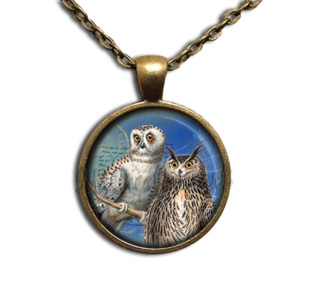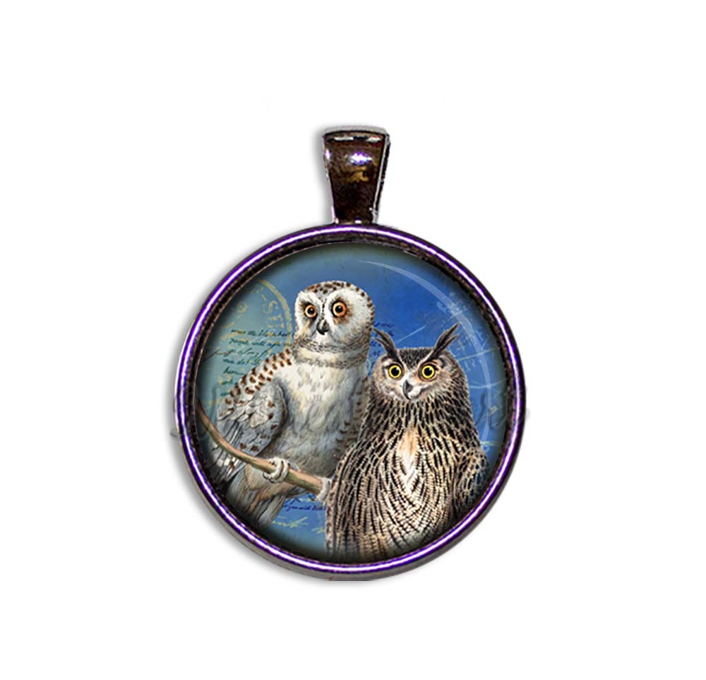 Discover our exquisite pendant necklace featuring a charming perched barred owl and majestic great horned owl set against a vibrant blue background. Crafted from high-quality glass, these necklaces are available in four elegant metal finishes: Antique Bronze, Antique Copper, Bright Silver, and Gunmetal Black. Perfect as a thoughtful and affordable gift for any occasion, each pendant is carefully designed to ensure durability and beauty.