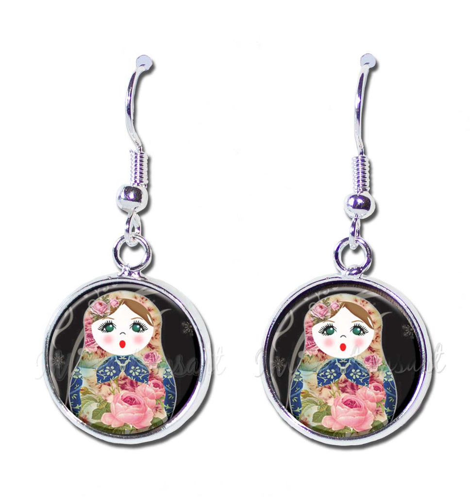 These stunning handmade French hook earrings feature Russian-inspired nesting dolls or Matryoshka in black, adorned with pink roses, making them a unique back-to-school accessory. Perfect for any occasion, they are an excellent gift option for birthdays, anniversaries, Mother’s Day, bridal favors, or holidays. Crafted in lightweight resin and available in various finishes such as Antique Bronze, Gunmetal Black, Rose Gold, and Silver Plated, these earrings combine comfort with distinctive style, making them a charming addition to any jewelry collection.