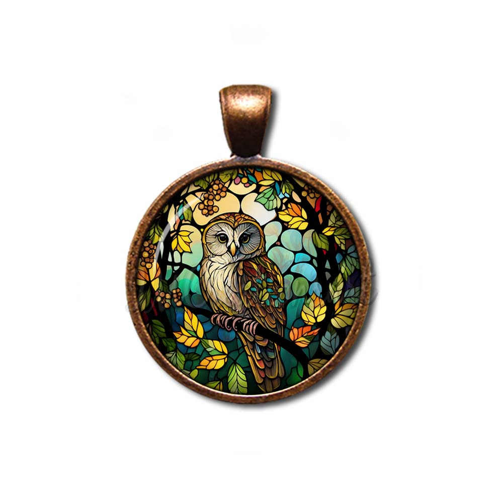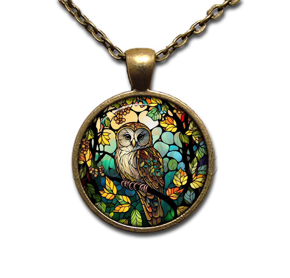 Discover our breathtaking, one-of-a-kind glass pendant necklace featuring a perched owl with a captivating faux stained glass appearance, perfect for embracing the autumn season. Available in four exquisite metal finishes—Antique Bronze, Antique Copper, Bright Silver, and Gunmetal Black. These beautifully crafted necklaces make an affordable and distinctive gift for any occasion, with each pendant carefully designed to ensure exceptional quality and charm.
