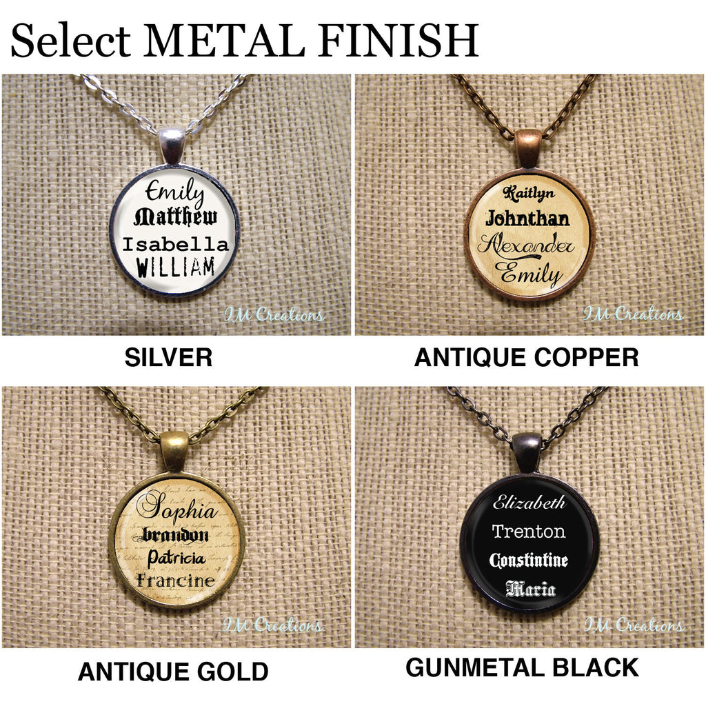 From the drop-down menu please select which finish, background, and length of chain you prefer. (The color of the necklace will match the metal finish).
